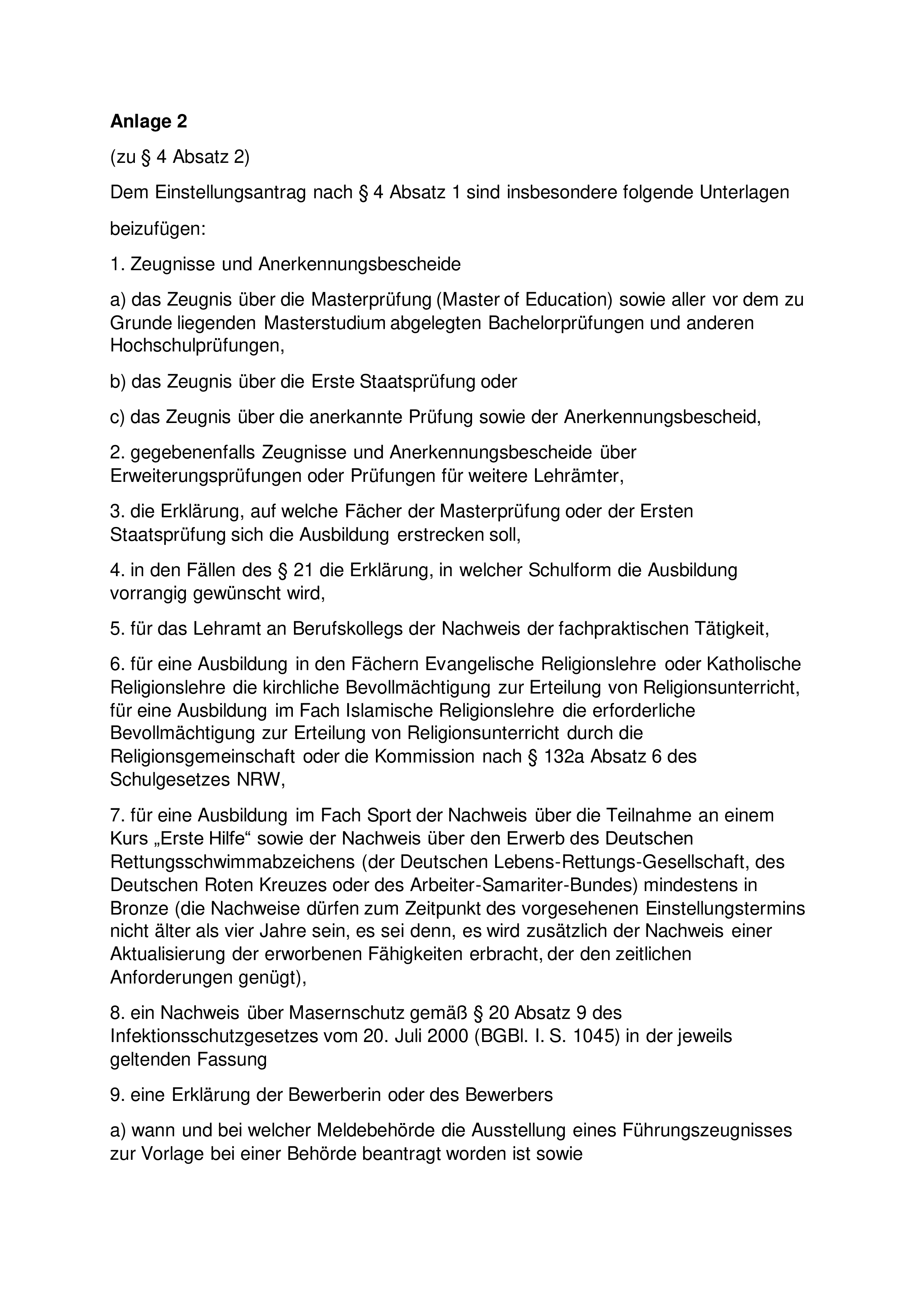 (2) Die Einstellung erfolgt nicht, wenn die Fächer (Unterrichtsfächer, Lernbereiche, berufliche Fachrichtungen, sonderpädagogische Fachrichtungen) und ihre Mindestzahl nicht den im Land Nordrhein-Westfalen geltenden Bestimmungen entsprechen. Das für Schulen zuständige Ministerium kann in besonders begründeten Fällen Ausnahmen zulassen, wenn eine Ausbildung in einem Zentrum für schulpraktische Lehrkräfteausbildung fachlich möglich und durchführbar ist. Die Einstellung erfolgt auch nicht, wenn die Bewerberin oder der Bewerber im Rahmen eines Vorbereitungsdienstes für ein entsprechendes Lehramt eine Staatsprüfung endgültig nicht bestanden hat.