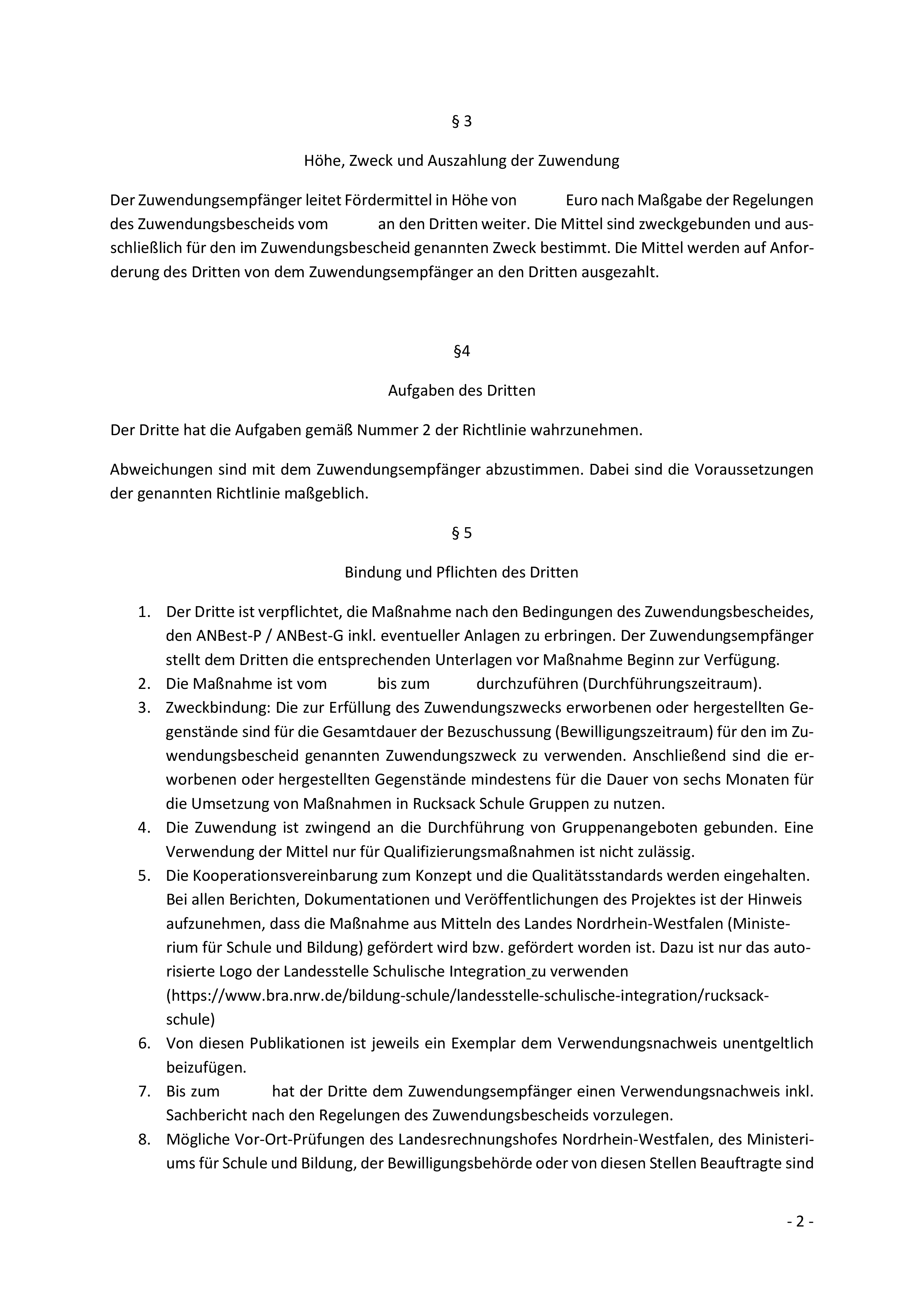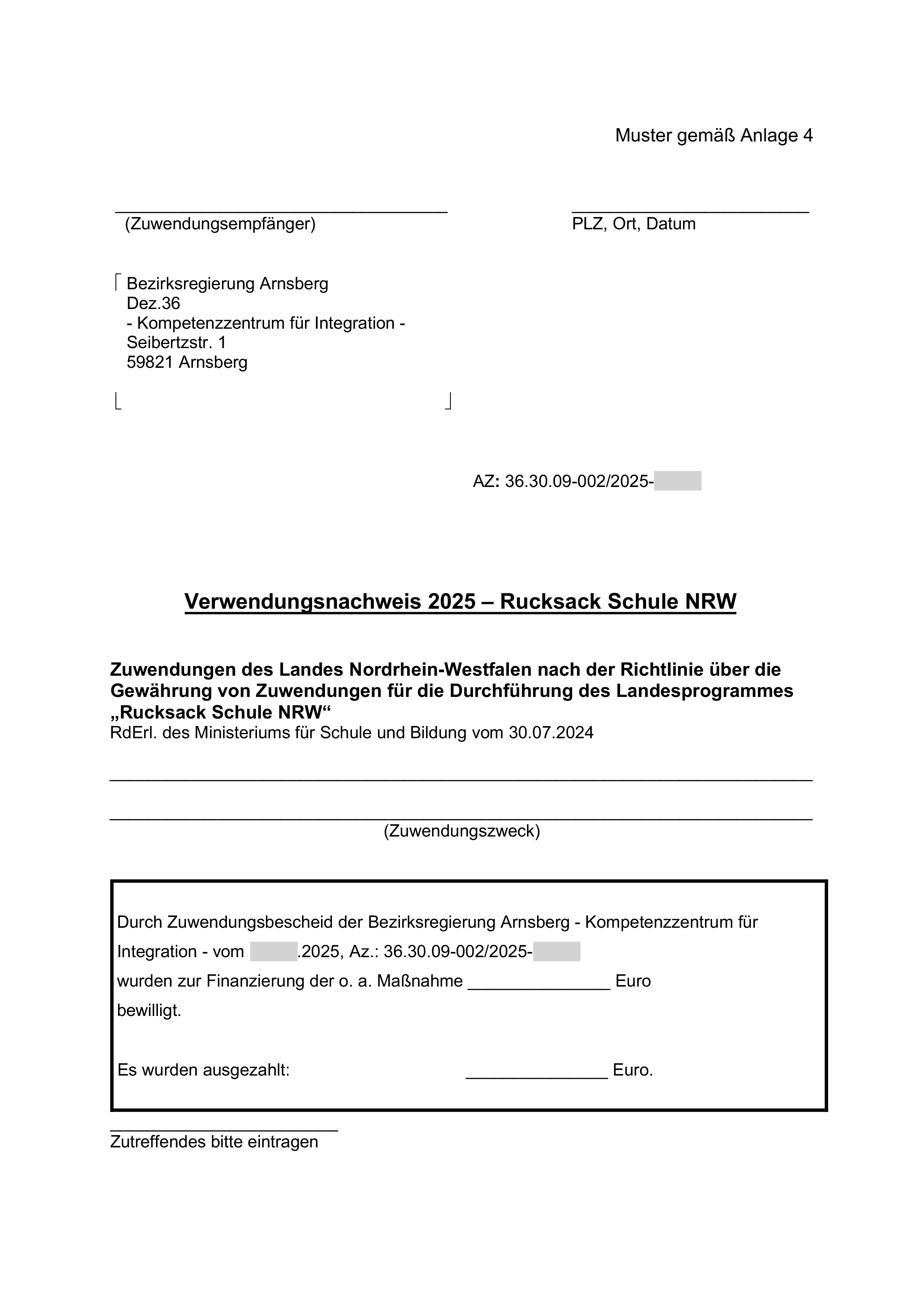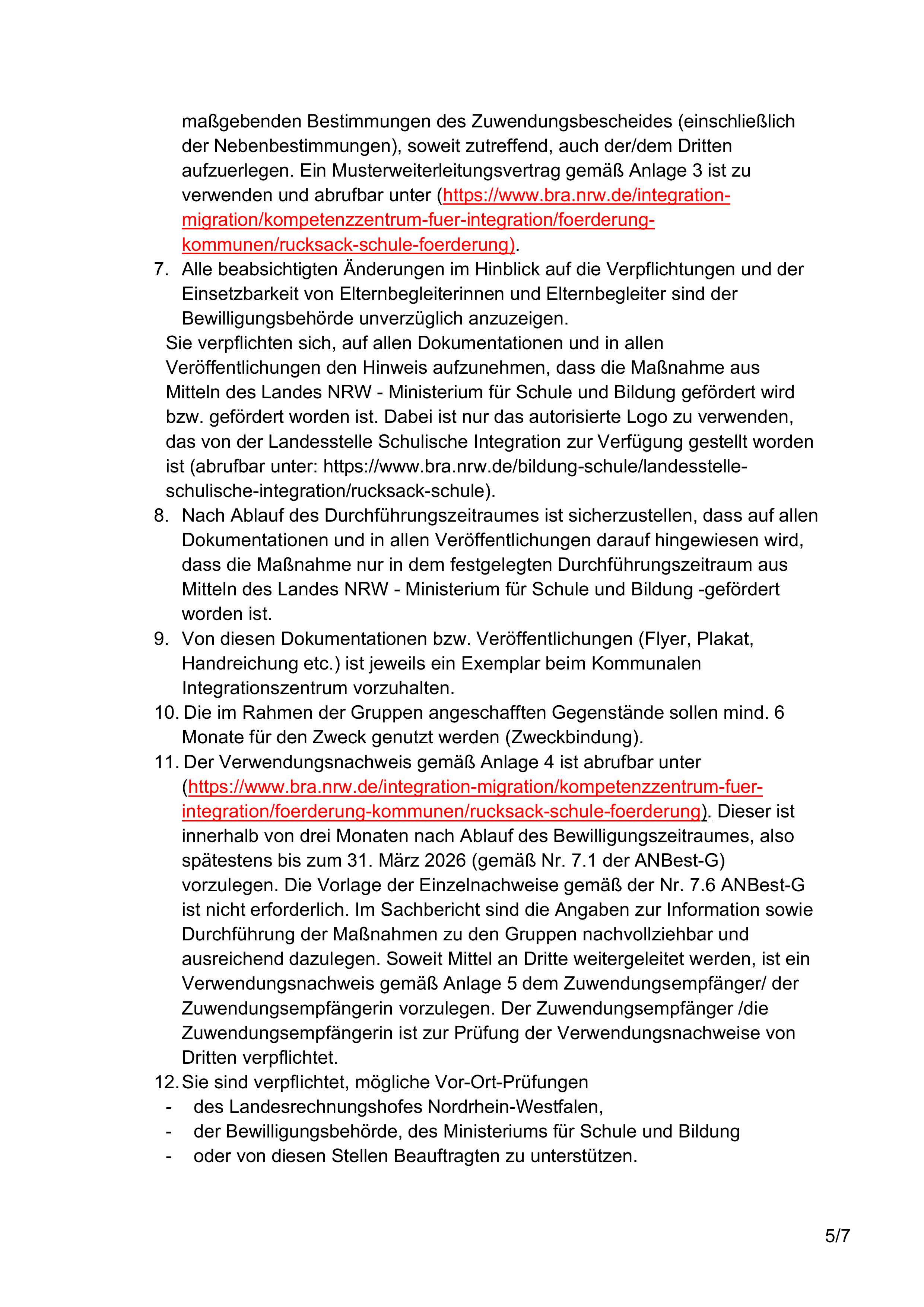 Die Gültigkeit des bestehenden Erlasses BASS 11-02 Nr. 50 „Richtlinie über die Gewährung von Zuwendungen für die Durchführung des Landesprogramms „Rucksack Schule NRW““ wird um fünf Monate bis zum 31. Dezember 2025 verlängert. Dadurch verlängern sich der Durchführungs- sowie der Bewilligungszeitraum. Anträge auf Gewährung der Zuwendung sind bis zum 31. Oktober 2025 zu stellen. |