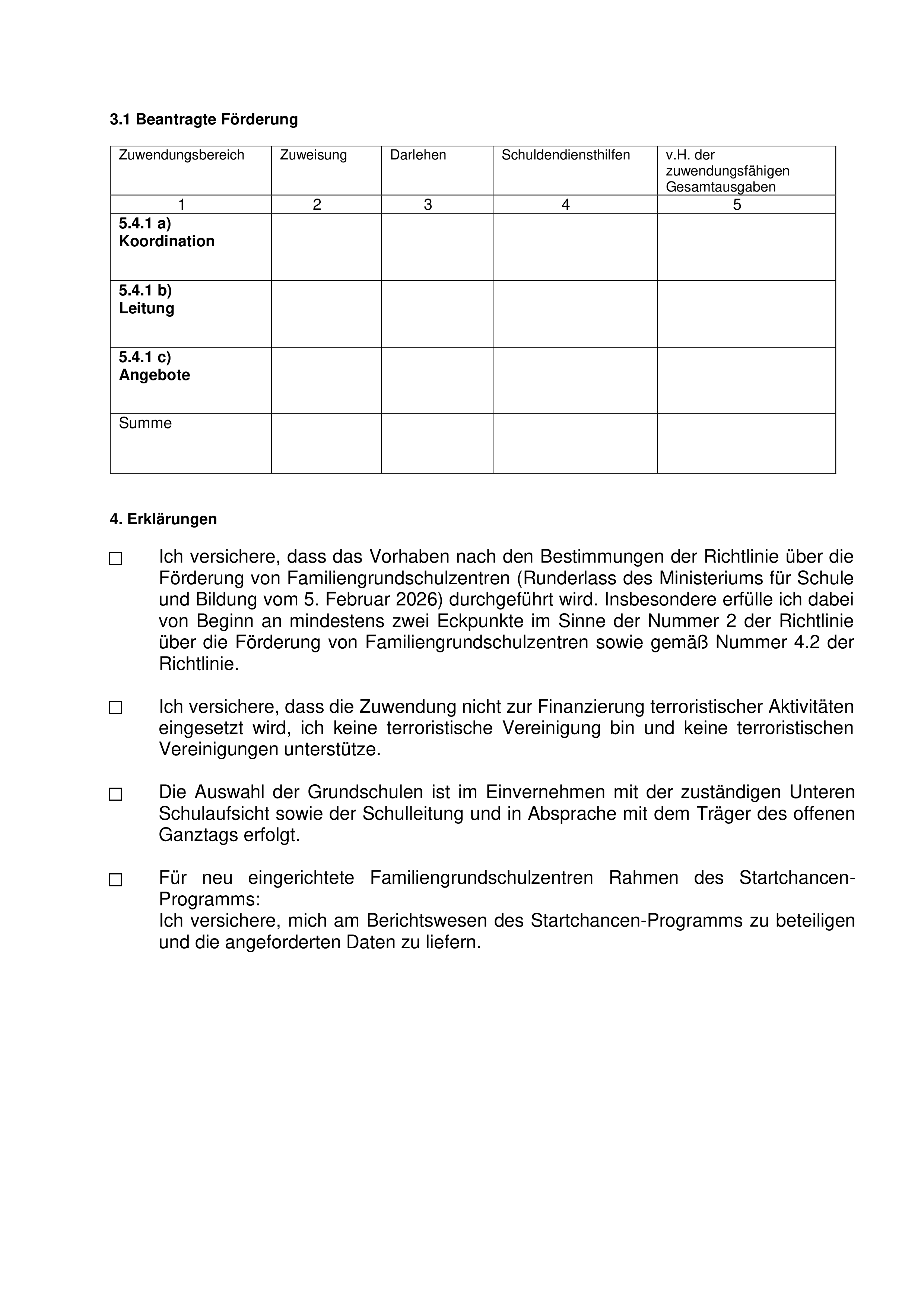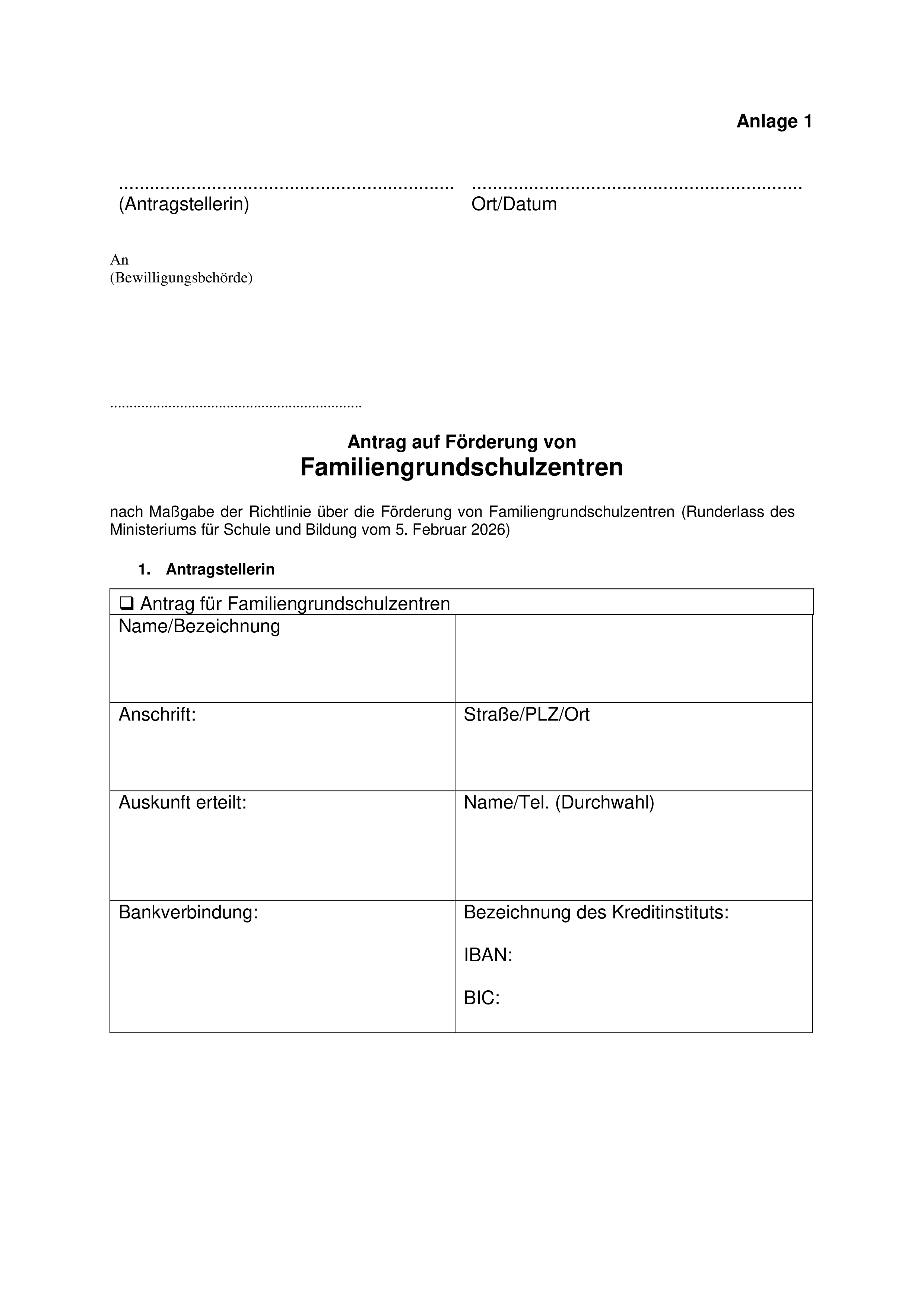 6.1.1 Anträge für bestehende Familiengrundschulzentren sind bis zum 31. Juli des jeweiligen Jahres für die Dauer eines Schuljahres zu stellen und können bei unverändertem Fortbestehen der Zuwendungsvoraussetzungen unter Nutzung der Anlage 1 übersandt werden. Dies ist im jeweiligen Antrag unter Verwendung des Musters gemäß Anlage 1 darzustellen.