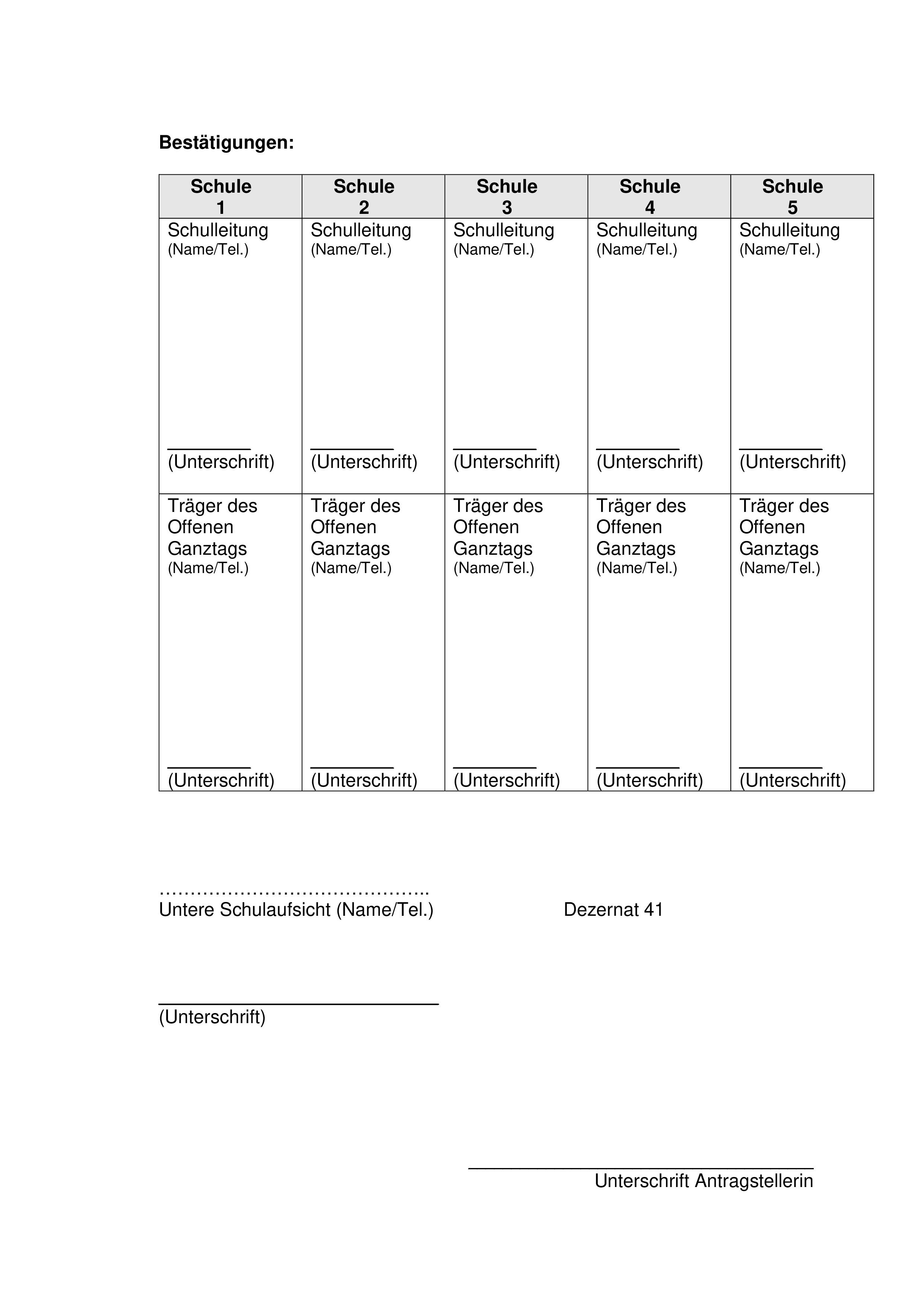 4.2.2 Die Auswahl der Schulen erfolgt durch die Antragstellerin oder den Antragsteller im Einvernehmen mit der zuständigen unteren Schulaufsicht, der jeweiligen Schulleitung (nach vorherigem Beschluss der Schulkonferenz) sowie dem jeweiligen Träger des Offenen Ganztags. Das Einvernehmen wird durch Unterschrift im Antrag gemäß Anlage 1 Nummer 4 bestätigt.