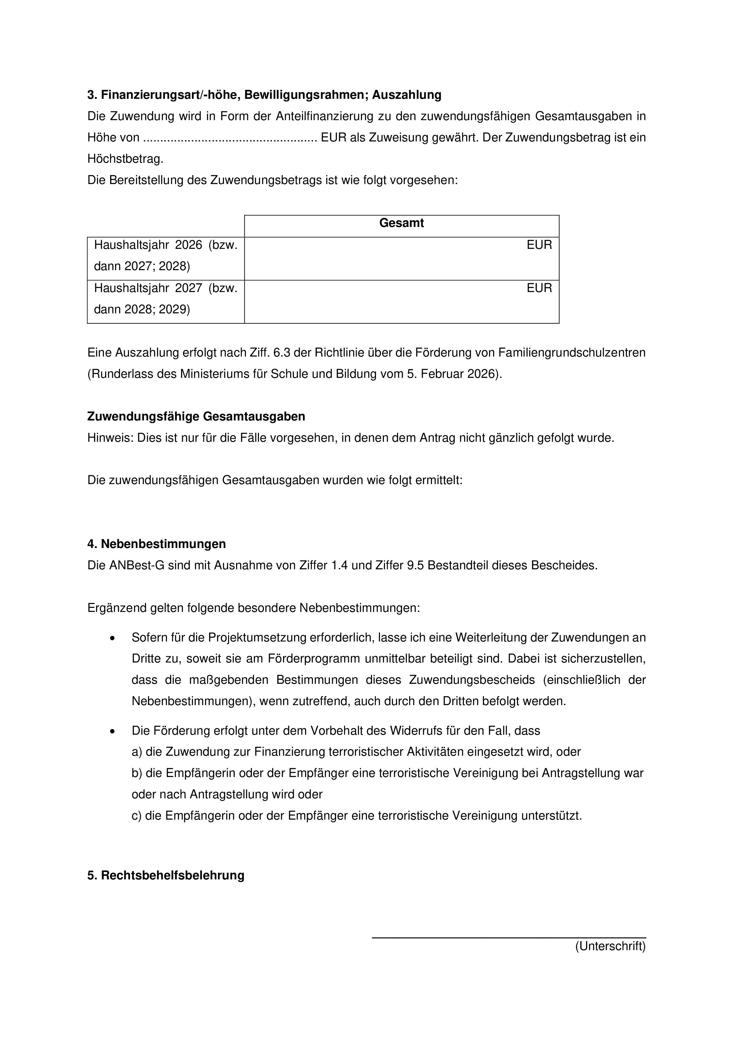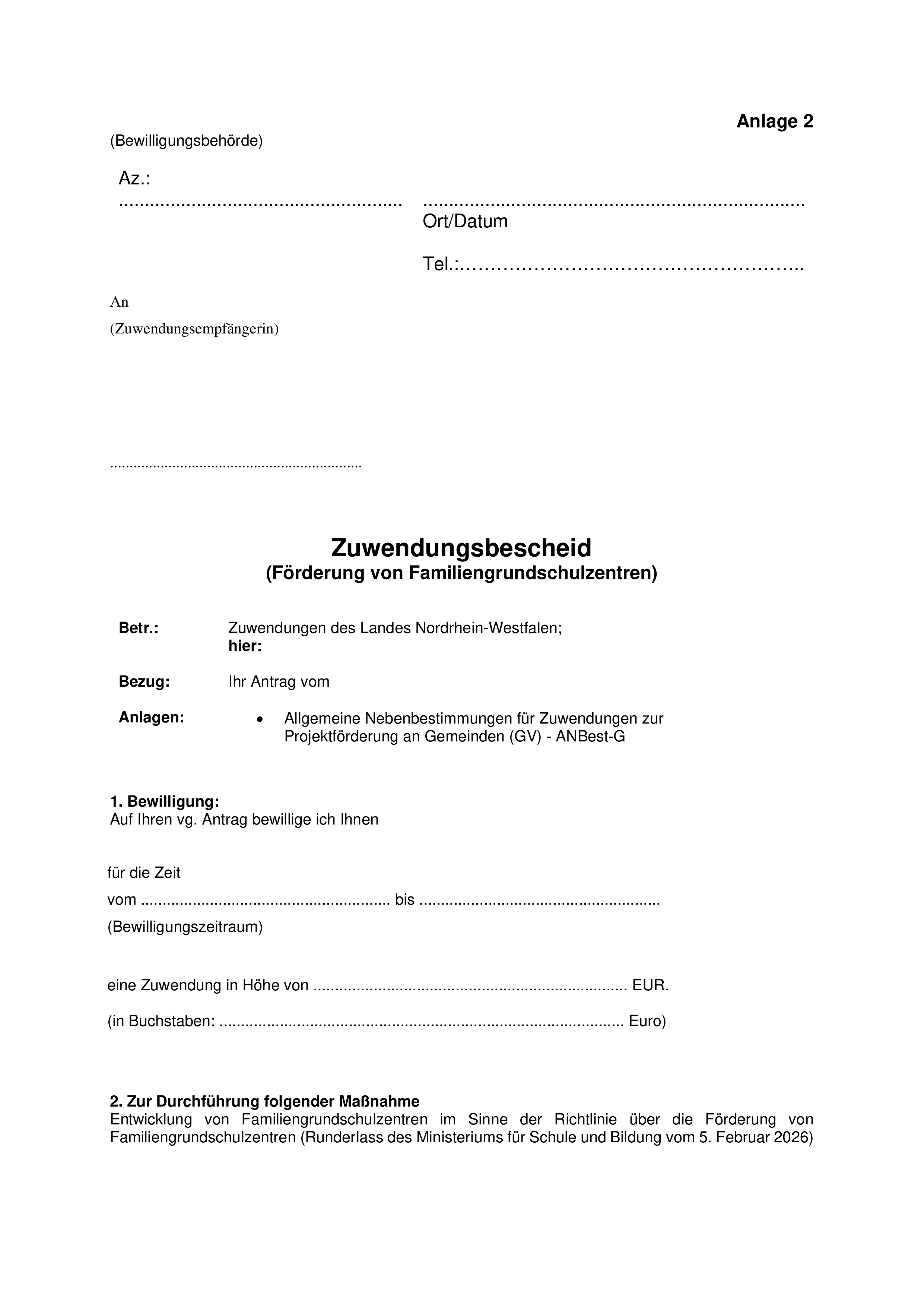 Das Land Nordrhein-Westfalen gewährt nach Maßgabe dieser Richtlinie und der Verwaltungsvorschriften zu § 44 Landeshaushaltsordnung in der jeweils geltenden Fassung Zuwendungen für den Betrieb von bestehenden Familiengrundschulzentren jeweils für die Dauer eines Schuljahres im Zeitraum 1. August 2026 bis 31. Juli 2029.