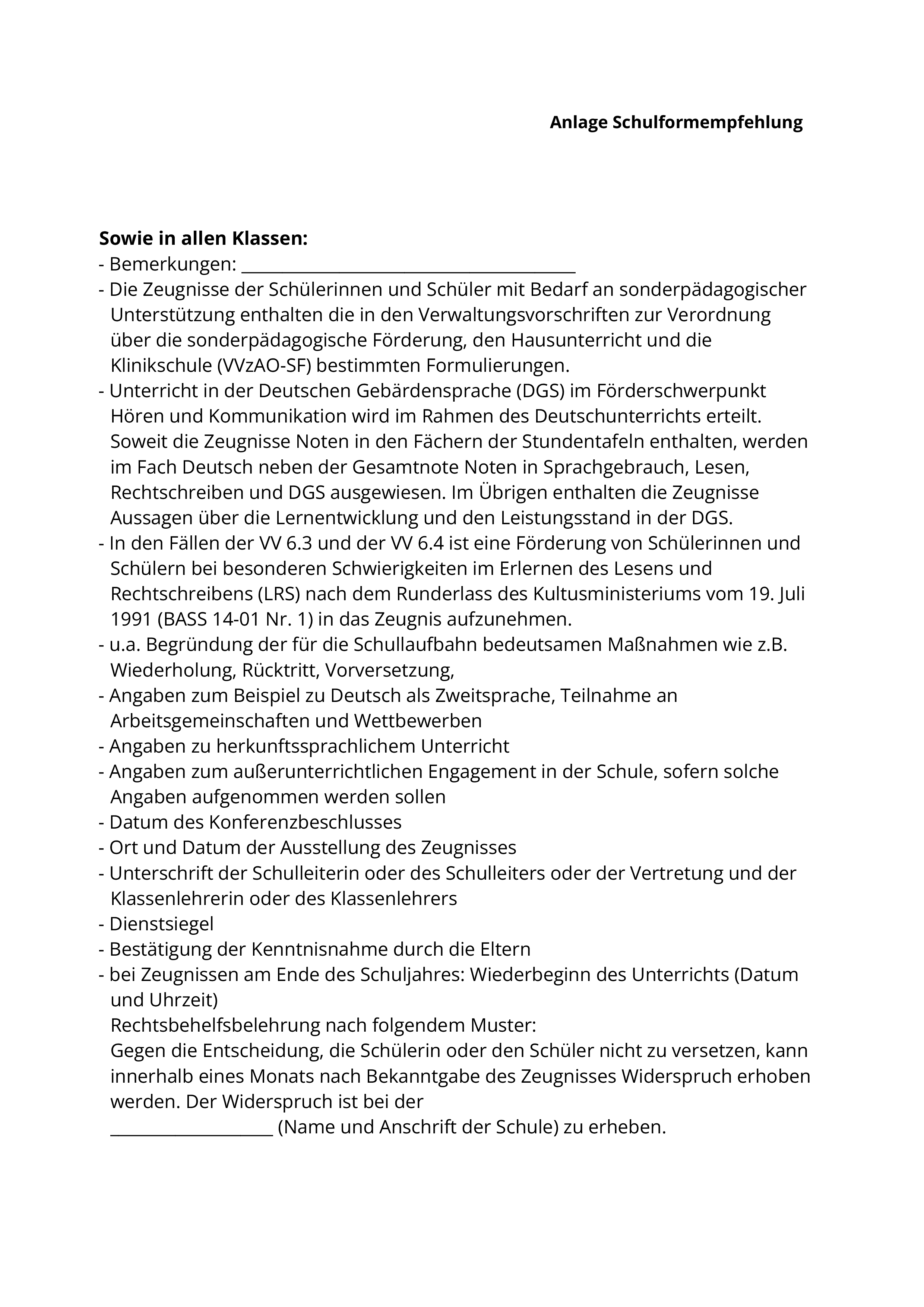 „- Unterricht in der Deutschen Gebärdensprache (DGS) im Förderschwerpunkt Hören und Kommunikation wird im Rahmen des Deutschunterrichts erteilt. Soweit die Zeugnisse Noten in den Fächern der Stundentafeln enthalten, werden im Fach Deutsch neben der Gesamtnote Noten in Sprachgebrauch, Lesen, Rechtschreiben und DGS ausgewiesen. Im Übrigen enthalten die Zeugnisse Aussagen über die Lernentwicklung und den Leistungsstand in der DGS.“