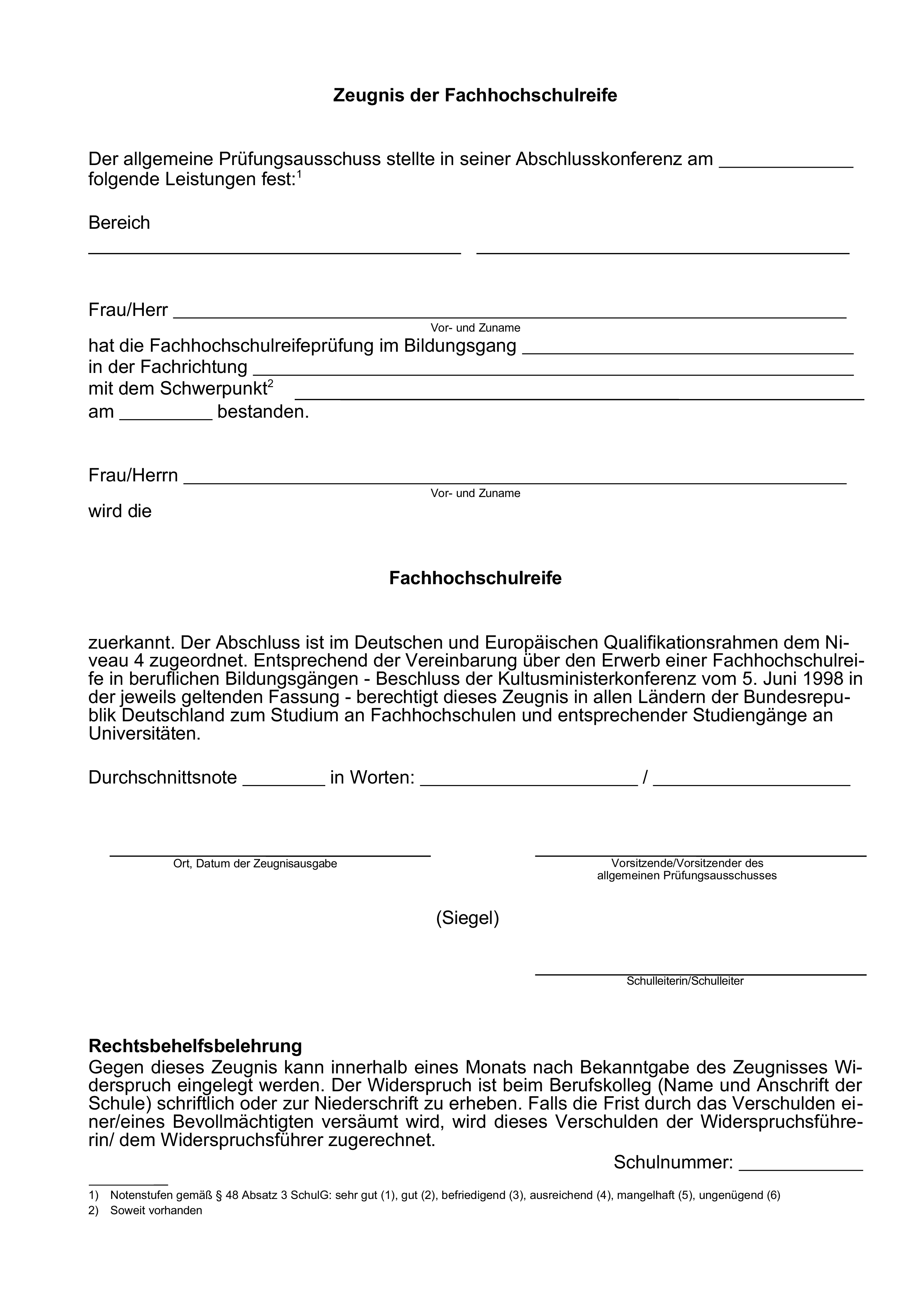 1) Fächer zum Erwerb der Fachhochschulreife 2) Deutsch/Kommunikation und Fremdsprache müssen bei Erwerb der Fachhochschulreife im Umfang von zusammen mindestens 240 Unterrichtsstunden erteilt werden. |